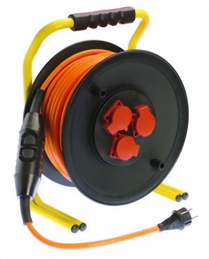 PRCD-S-Profi-Baustellentrommel. Profibaustellentrommel mit stoßdämpfendem, massivem, kunststoffbeschichtetem Doppelrohrgestell, hohe Standsicherheit, ergonomisch geformter Haltegriff, Feststellbremse mit großem Sterngriff, VDE-Thermoschutzschalter, PRCD-S Zwischenschalter, 3 Schutzkontaktsteckdosen mit Sicherheitsklappdeckeln mit Hammerzeichen . Leitung für extremste mechanische Beanspruchung geeignet. Ölbeständig und hoch abriebfest. Leitung in orangener Sicherheitsfarbe. Mit Schutzleiterüberwachung.