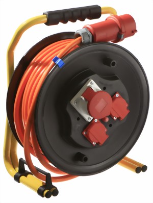 Sicherheitskabeltrommel 400 V CEE aus robustem, hochbruchfestem Spezialkunststoff, stoßdämpfendes, massives, kunststoffbeschichtetes Doppelrohrgestell, ergonomisch geformter Haltegriff, mit 3-poligem VDE-Thermoschutzschalter, 2 Schutzkontaktsteckdosen 230 V mit Sicherheitsklappdeckeln und Hammerzeichen , 1 CEE-Steckdose 5-polig, 400 V 16 A. Panzerleitung: Mechanisch extrem belastbare Industrieleitung, abriebfest, ölbeständig. In orangener Sicherheitsfarbe. Mit patentierter Leitungsführung.