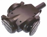 3-fach Verteilersteckdose. Vollgummi, schwere Ausführung, spritzwassergeschützt, mit drehbaren, selbstschließenden Sicherheitsklappdeckeln und Öse zum Aufhängen. Max. Querschnitt 2,5 mm².