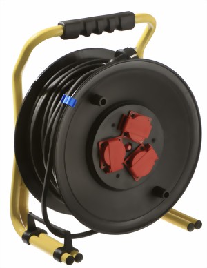 Profi-Kabeltrommel mit stoßdämpfendem, massivem, kunststoffbeschichtetem Doppelrohrgestell, hohe Standsicherheit, ergonomisch geformtem Haltegriff, Feststellbremse mit großem Sterngriff. Trommelkörper aus robustem hochbruchfestem Spezialkunststoff mit VDE-Thermoschutzschalter und 3 Schutzkontaktsteckdosen mit Sicherheitsklappdeckeln und Hammerzeichen. Mit patentierter Leitungsführung.