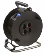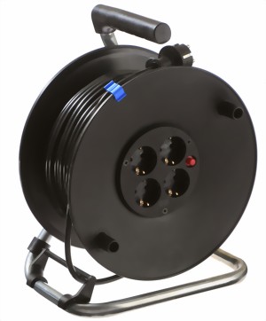 Sicherheits-Kabeltrommel aus robustem, hochbruchfestem Spezialkunststoff, stoßdämpfendes, stabiles, verzinktes Fußgestell, Feststellbremse, ergonomisch geformter Haltegriff, VDE-Thermoschutzschalter und 4 Schutzkontaktsteckdosen. Mit patentierter Leitungsführung.