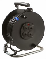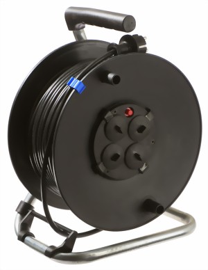 Sicherheits-Kabeltrommel aus robustem, hochbruchfestem Spezialkunststoff, stoßdämpfendes, stabiles, verzinktes Fußgestell, Feststellbremse, ergonomisch geformtem Haltegriff, VDE-Thermoschutzschalter und 4 Schutzkontaktsteckdosen mit Schutzkappen. Mit patentierter Leitungsführung