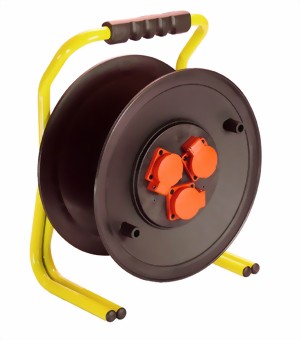 Profi-Sicherheits-Leertrommel aus hochbruchfestem Spezialkunststoff, mit stoßdämpfendem, massivem, kunststoffbeschichtetem Doppelrohrgestell, Feststellbremse mit großem Sterngriff, ergonomisch geformtem Haltegriff, VDE-Thermoschutzschalter, 3 Schutzkontaktsteckdosen mit Sicherheitsklappdeckeln und Hammerzeichen. Bauteile geprüft nach TÜV / GS, mit entsprechend zugelassener Leitung, durch eine Elektrofachkraft anzuschließen.