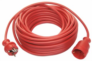 Kunststoff-Verlängerungsleitung mit Schutzkontaktstecker und Schutzkontaktkupplung, Leitung in roter Sicherheitsfarbe.
