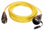 Panzer-Verlängerungsleitung mit Schutzkontaktstecker und Schutzkontaktkupplung. Leitung in gelber Sicherheitsfarbe.