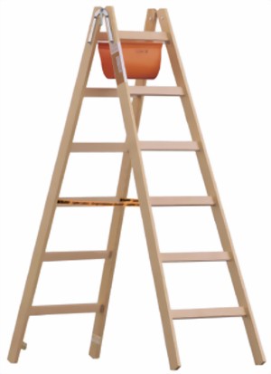 Beidseitig begehbar, mit Werkzeugtasche, Spreizsicherung durch 2 reißfeste Polyester-Gurtbänder, robust konstruierte und verzinkte Stahlscharniere mit Eimerhaken, Transportsicherung aus Holz am Leiterfuß. Holme aus massivem Rotkiefernholz. Sprossen aus stabilem Buchenholz.